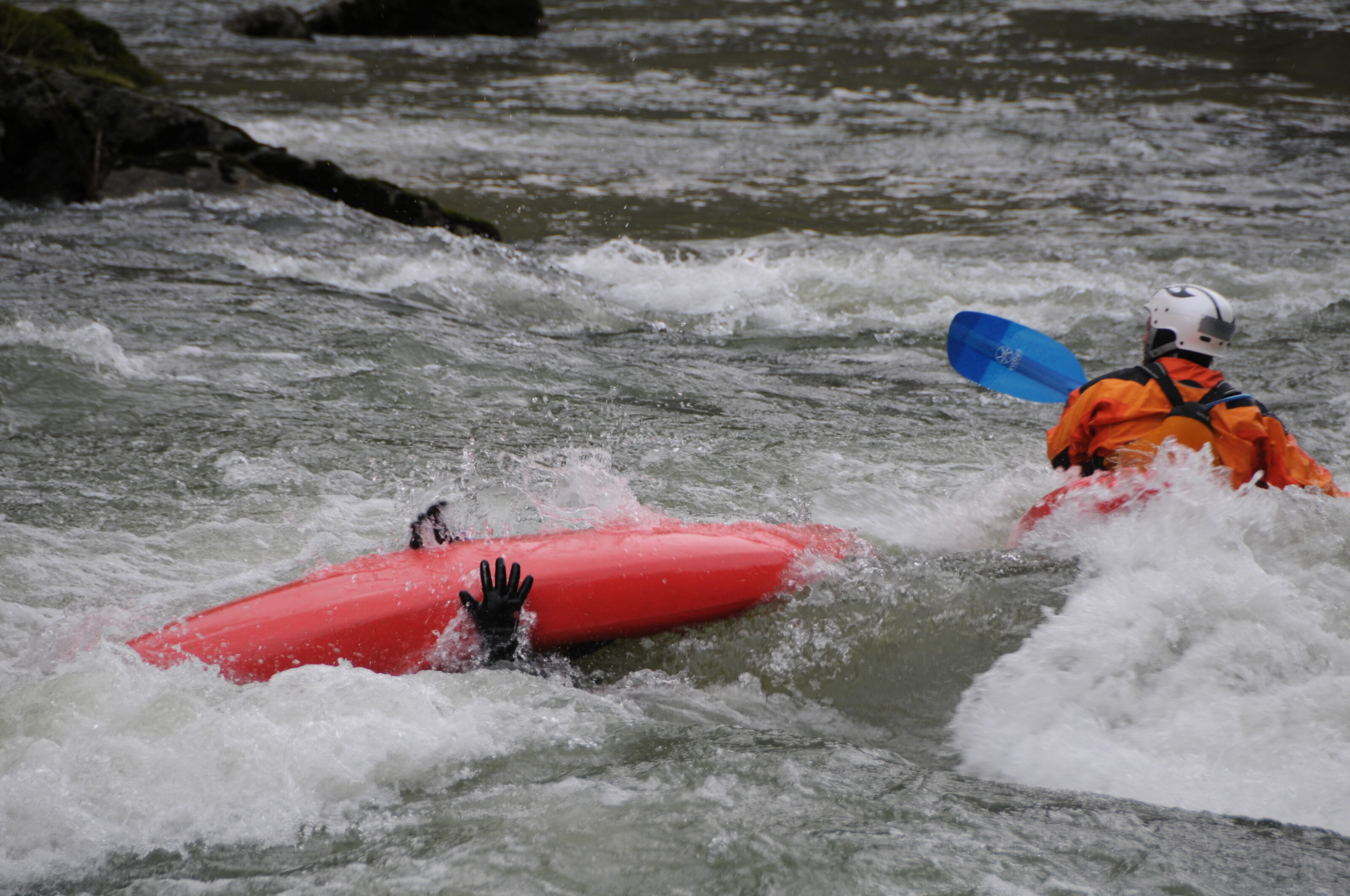 Rolig, rolig, bli rolig! Kroppen vrir seg. Lungene vil ha luft. Kan ikke få panikk. Kan ikke få panikk. Panikken spiser mye oksygen. Jeg vet det. Oksygen er dyrbart nå. Må bli rolig. Har noen sett meg? Kroppen har lyst til å dra seg ut. Jeg prøver å trosse ubehaget. Alternativet er verre. Sakte kjenner jeg kroppen aksepterer sin tilstand. Jeg løfter armene. Et rop om hjelp. Kan ikke vite om noen svarer. Slår hendene mot kajakken. En gang. Ikke mer. Kan ikke bruke for mye luft. Var det noen i nærheten? Jeg husker ikke. Kanskje bør jeg bare gi opp. La kroppen trekke seg ut. Akseptere å bli gjennomvåt og at padledagen er over. Kroppen vil det. Venter. Vannet er kaldt. Kanskje 10 grader. Jeg kan kjenne det sildre inn i våtdrakten. Lungene er nesten tomme for luft. Venter. Hvor lang tid har gått? Prøver å se for meg verden der oppe. Det brusende vannet. Valsene. Her nede er alt så stille. Kanskje kjemper en eller annen seg i strykene mot meg. Jeg liker den tanken. Lungene er tomme nå. Er det noen der? Det må minst ha gått et halvt minutt. Føles sånn. Venter litt til. Munnen vil gape. Om enn bare for å trekke vann. Kommer det noen? Kanskje piner jeg meg selv for ingen nytte. Gir de fem sekunder til. Hvor er de? Hendene vil ned til spruttrekket. Kroppen prøver å redde seg selv. Men jeg kjemper imot. Lungene er over overtid. Tre sekunder til. To. Neonprenhanskene kjenner noe. En hard kant. Hvem har kommet? Finner ikke helt taket. Men så, jo! Drar meg opp. Endelig!