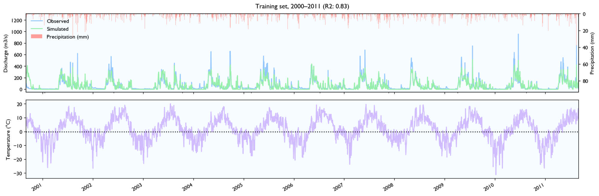 I used a short 15-years dataset from Hagabru, a discharge station in the Gaula river system, south of Trondheim (Norway). This catchment has a big area of 3059,5 km2 and no lakes to dampen responses. The first 12-years are used as training set, the last 3 years as validation set.