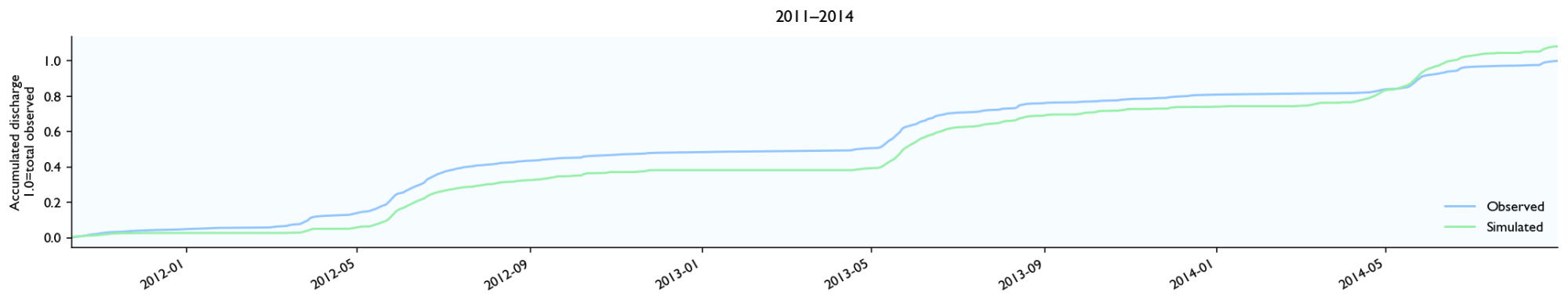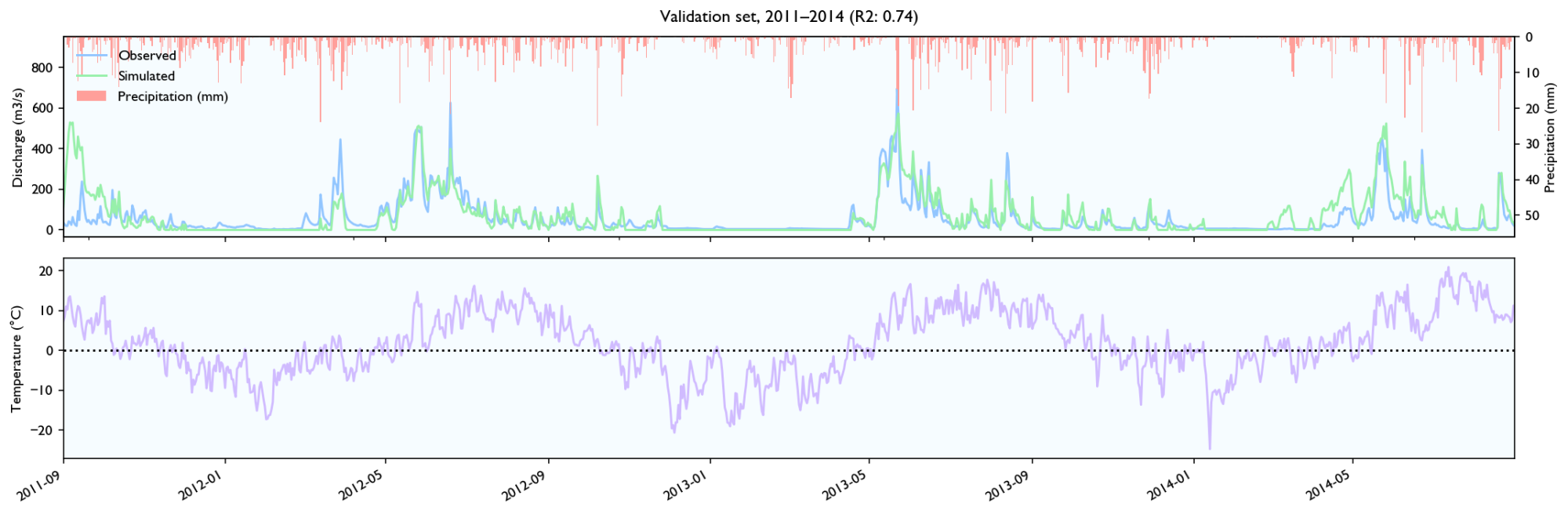 - It seems to be able to learn to store snow, but it is hard to know how accurately it records and store snow levels. The model seems to output more water after winters with more precipitation, and it looks like the accumulated discharge is neither severely over- or underestimated during spring melt the two first years in the validation set. However, in 2014 the discharge is way too high over time.