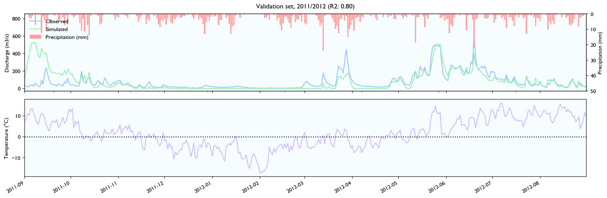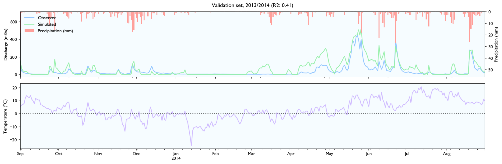 - The model struggles with spring melt when the temperature is near zero, for instance in March and April 2014, and March 2012. When the temperature is high, like in June 2012, the estimates are good. Snowmelt around zero is something all hydrological models struggle with because snowmelt is affected not only by temperature, but also wind, humidity and in-/outgoing radiation (e.g. clear nights). It still performs worse than HBV, but the HBV is configured with the elevation distribution of the catchment and the estimated temperature on different elevations, while the LSTM-network needs to learn it, so it should perform worse.