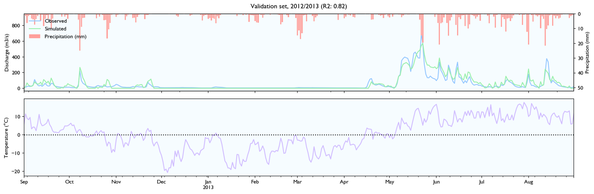 There have been some papers out there that have tried to model rainfall-runoff and sometimes snow storage with LSTM neural networks. For instance Kratzert et al. (2018)1 who archives a median Nash–Sutcliffe efficiency/R2 of 0.65 on 250 catchments in the US, -0.03 less than a traditional SAC-SMA+SNOW17 model. The results seem good, but not jet as good as old fashion models, like SAC-SMA+SNOW17 or HBV, which also are more robust.